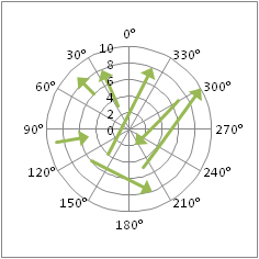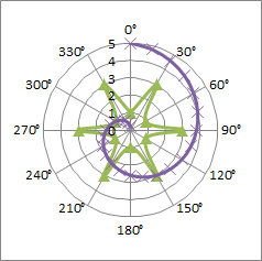 The Data tab allows you to select the data range. The data layout should be angles in first column with adjacent columns containing distance data for each series you which to include in the plot. By default the calculated chart data will be stored to the right of your data with a single column space between. This new data is a store of the chart options as well as information use to create the charts labelling, axes and then actual series lines. Once you have created your polar chart you can edit it using the Update button added to the Design tab of the Chart Tools contextual tab.